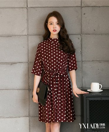 中领系带棕色白波点连衣裙+黑色尖头高跟鞋;搭配看点:经典又自然的棕色白波点连衣裙,时尚甜美范儿,随意之间透露出一丝成熟女人味。中领的设计,朴素而复古,腰间系带的款式巧思,将美好的腰部曲线勾勒了出来,高贵而大方。脚上搭配一双白搭的黑色尖头高跟鞋,为整体带来典雅复古的淑女气质。气质能很整体的透出来。