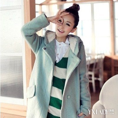 淡蓝色的毛呢面料的大衣,挺括的面料,让衣衣呈现出非常立体的线条,连帽的设计,略显甜美的休闲风,衣身上采用了弧度感觉的剪裁,让线条更加的分明。