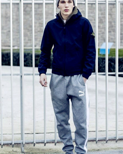 或者如图中的夹克搭配连帽卫衣,下身休闲裤与休闲鞋的搭配非常和谐,头上的包头针织帽增加了分量感,冬季这样的单配既摆脱了厚重感,又给人一种轻松的感觉,运动感十足。