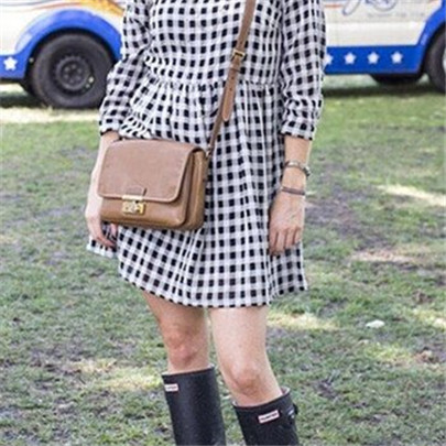 格子花纹的连衣裙加上雨靴,给人邻家的感觉,还可以在腰间背个小包做装饰。腿比较长的女生可以搭配长筒的雨靴 ,而腿没那么长的,也可以选择超短的连衣裙或者是及踝的雨靴,让腿部尽量多地露出来。