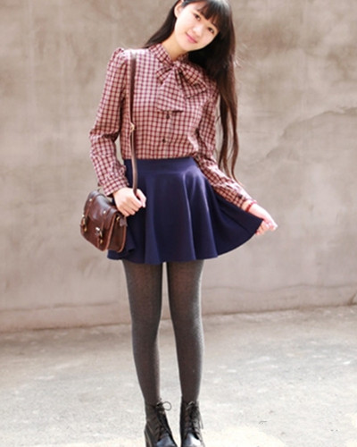 红色格子长袖衬衫,蝴蝶结装饰的领结设计,更显甜美减龄。搭配藏蓝色伞裙,配上丝袜和厚底短靴,配上棕色单肩包,迷人养眼。