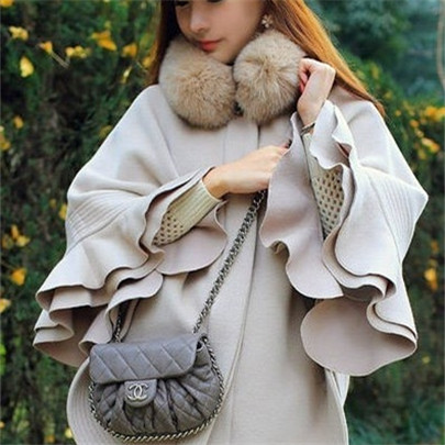 这件韩版的斗篷呢子大衣在颜色上并没有过多的设计,显得简单大方,穿起来很有复古的气质。袖子处采用的是荷叶边的设计更有甜美气质,下半身搭配一条紧身裤,非常显瘦。