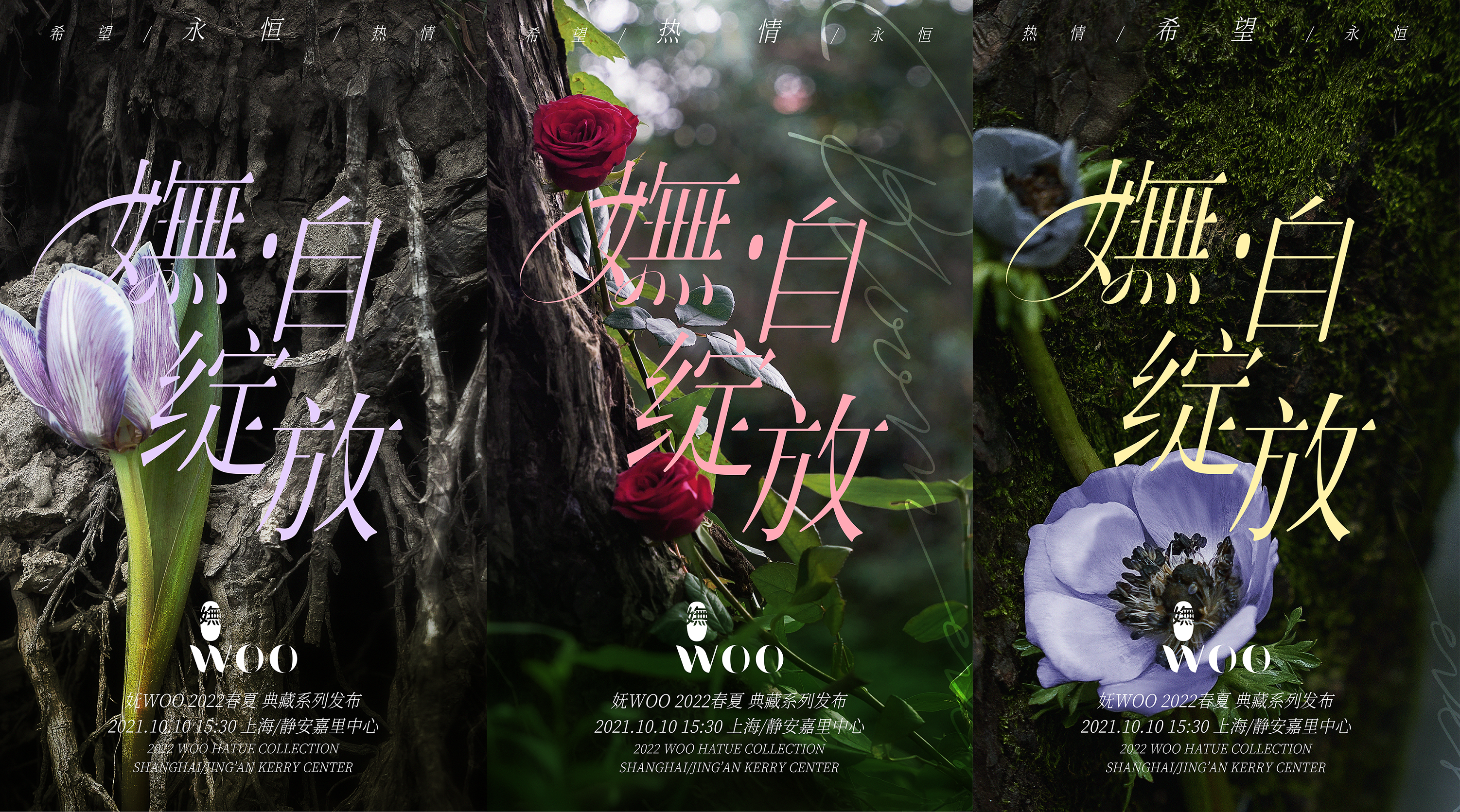 对女性而言,认识自我、接纳自我、不懈探索自我,是其珍贵的特质所在。如同大自然中自由绽放的花朵,妩WOO也寻求具有代表性的花卉诠释本季所要表达的女性精神,提取了三种美好花语作为创意:银莲象征希望,玫瑰代表热情,郁金香诉说永恒,以传达“嫵·自绽放”的女性力量。